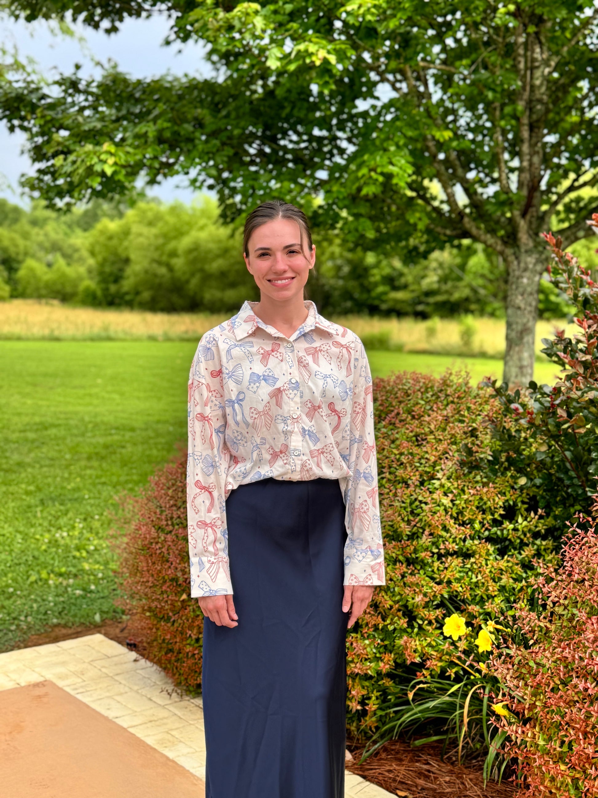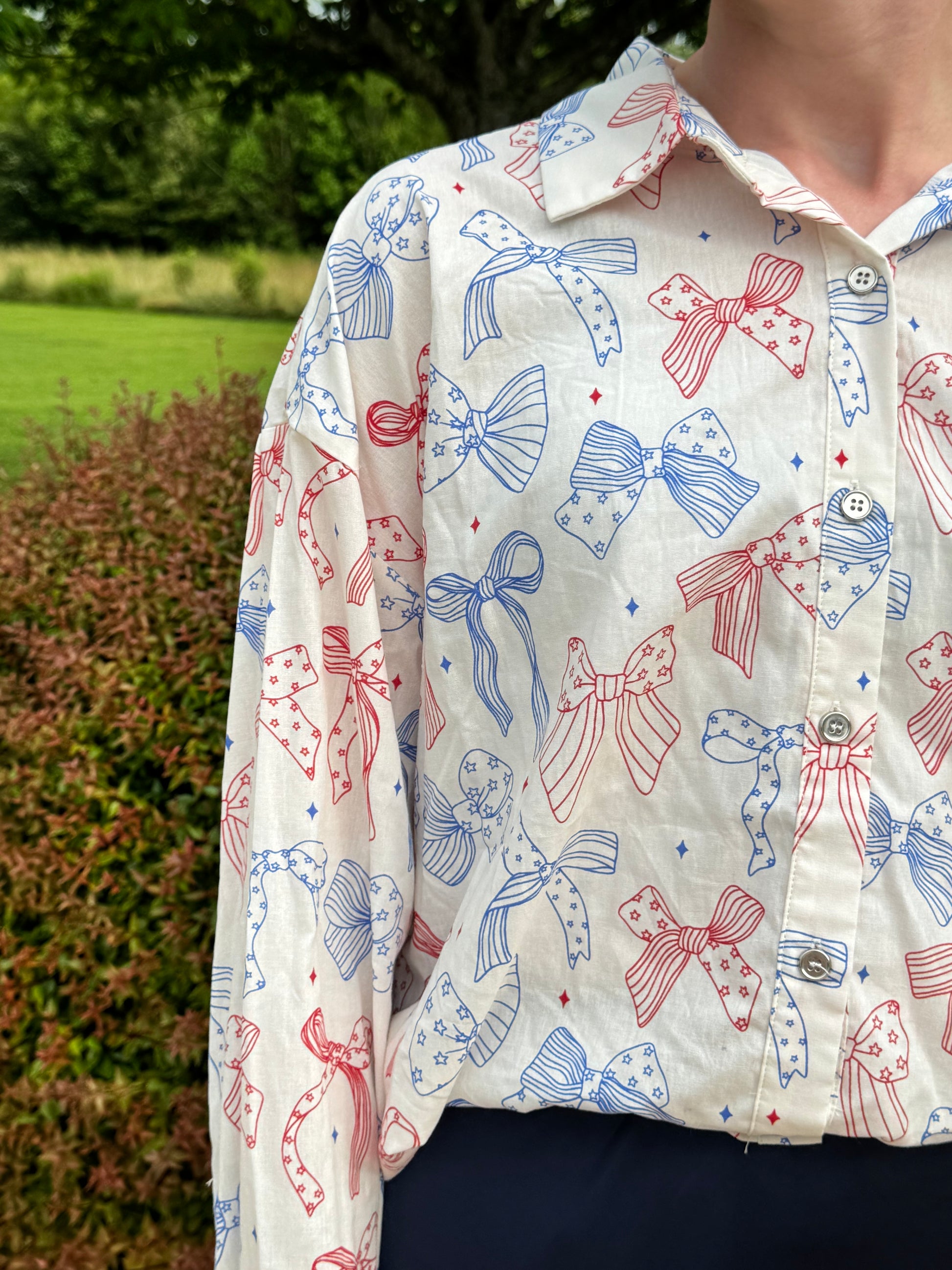The Libby Belle Top features a patriotic bow and button down design, making it the perfect addition to your wardrobe for the upcoming 4th of July celebration. Show off your holiday spirit in this stylish and patriotic top.