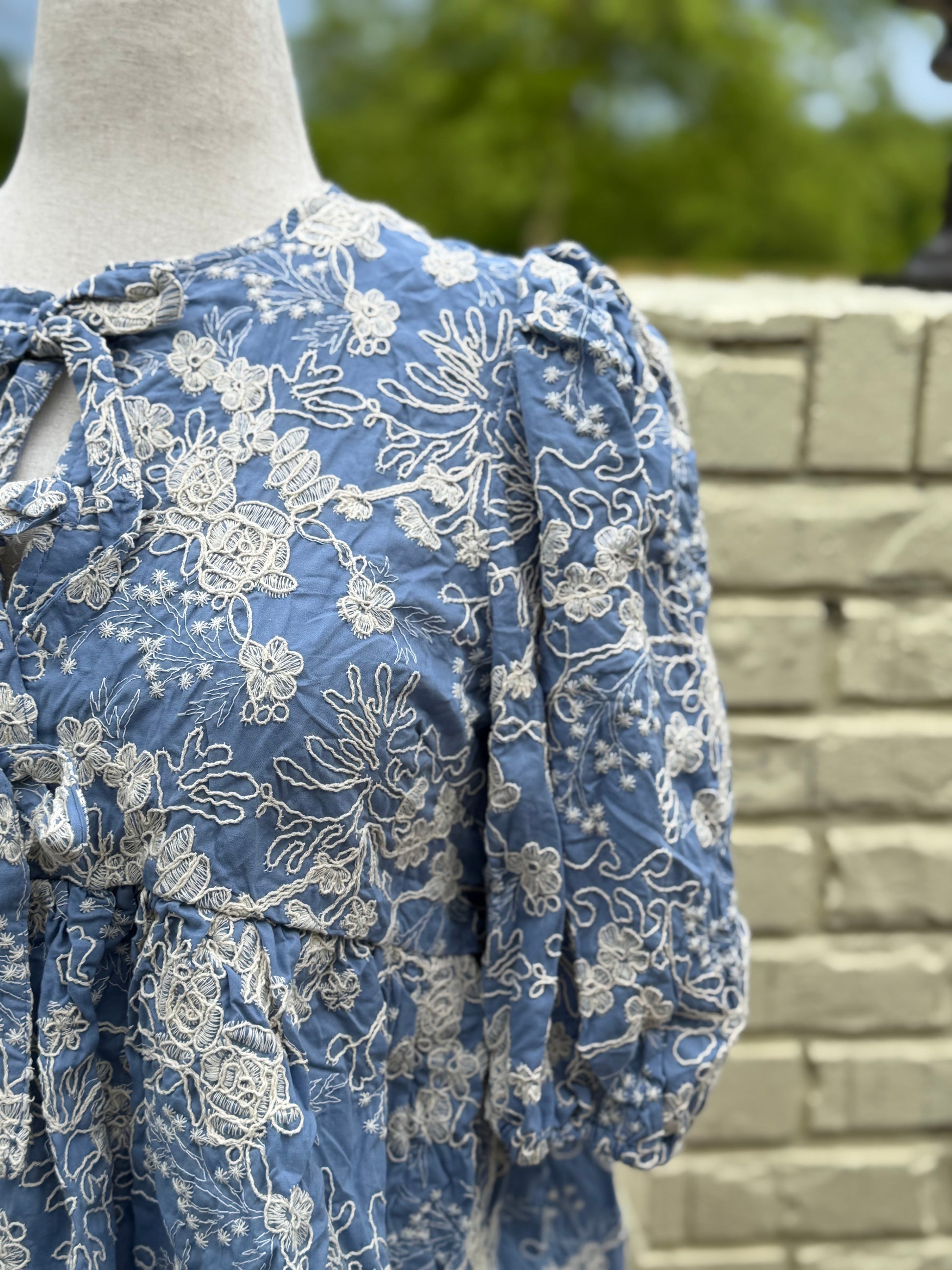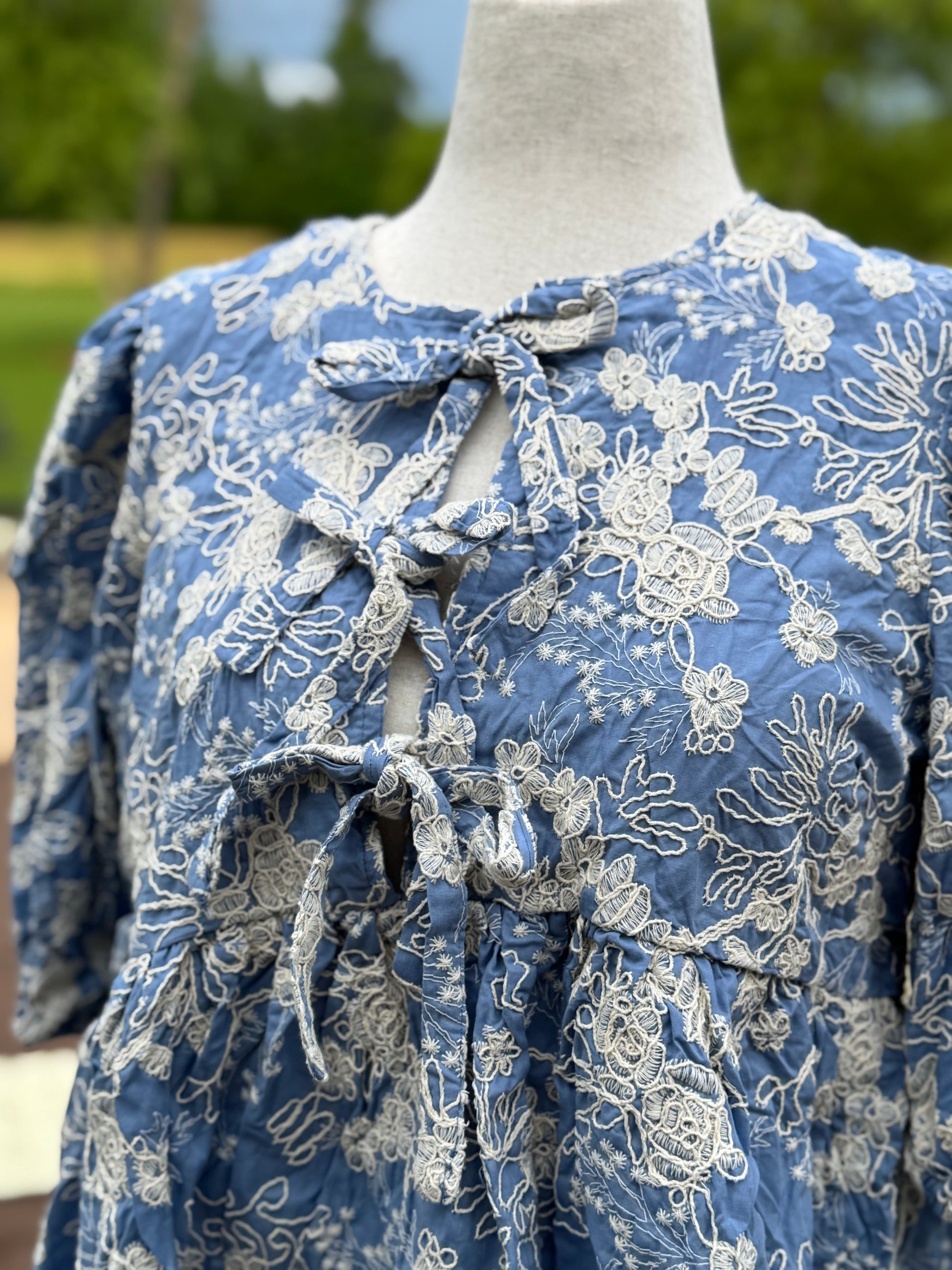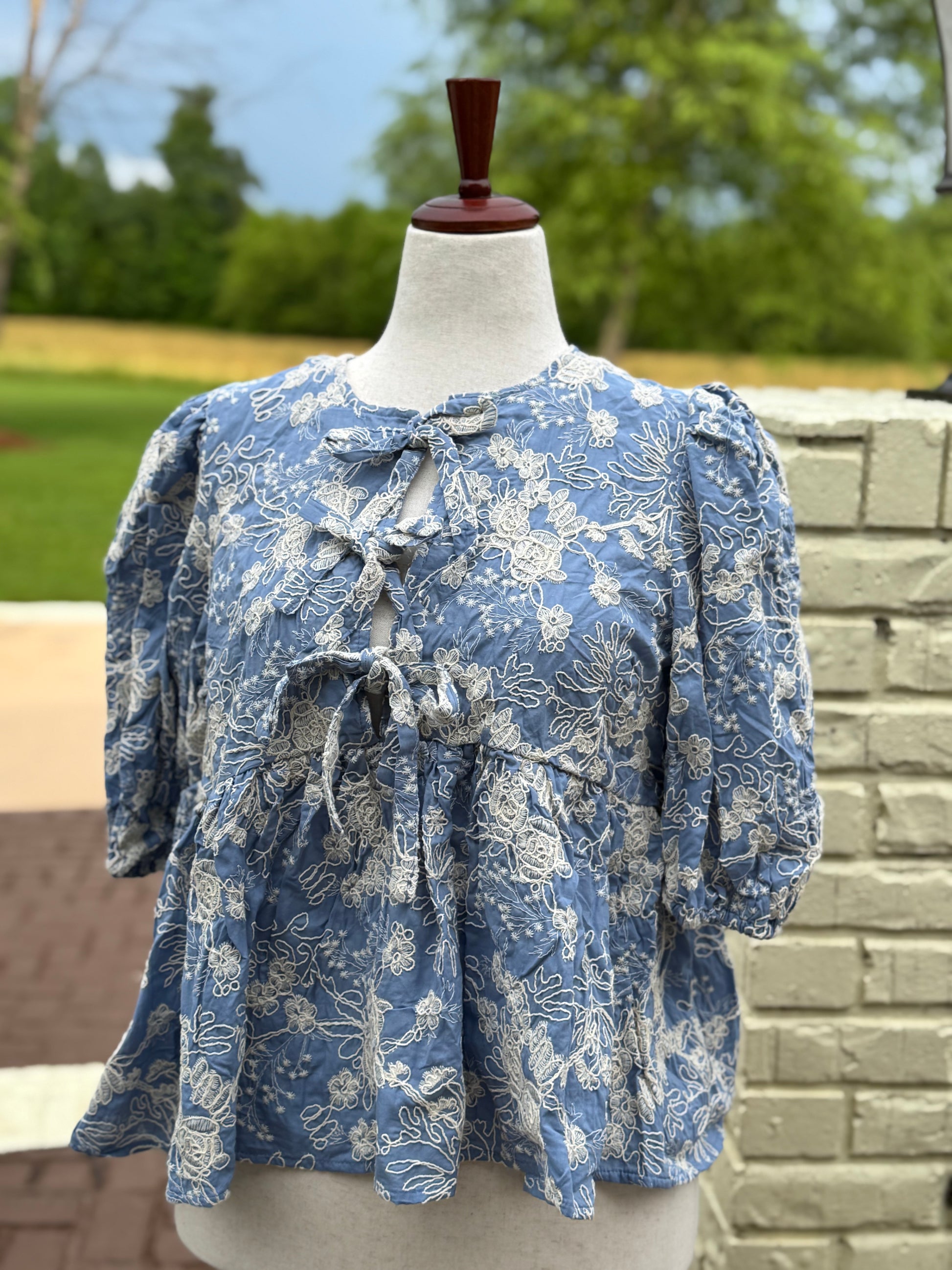 The Juliette Top is a must-have for any summer wardrobe. Its denim blue and white design is both stylish and versatile. With charming bow tie details down the front, this top will elevate any outfit. Stay cool and fashionable with the Juliette Top.