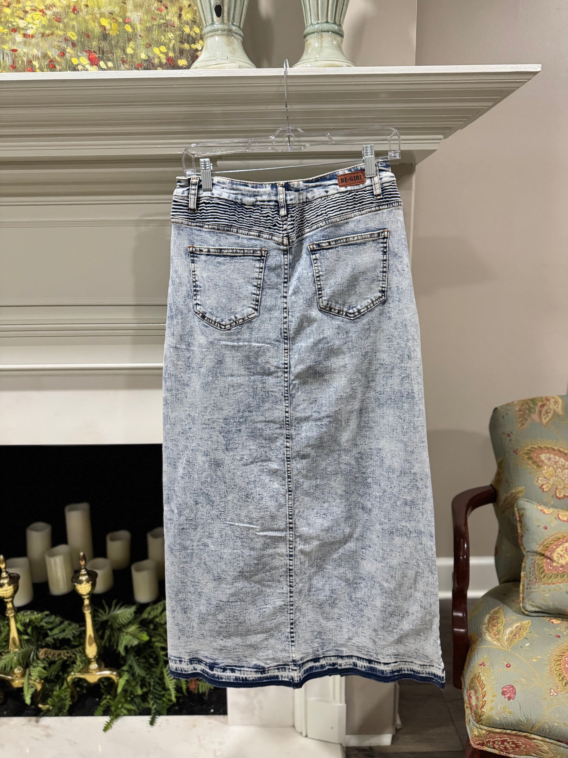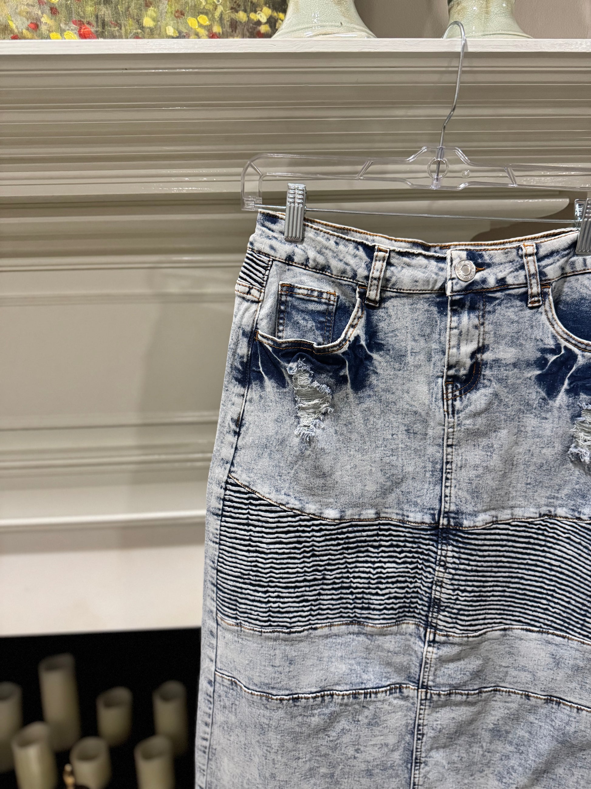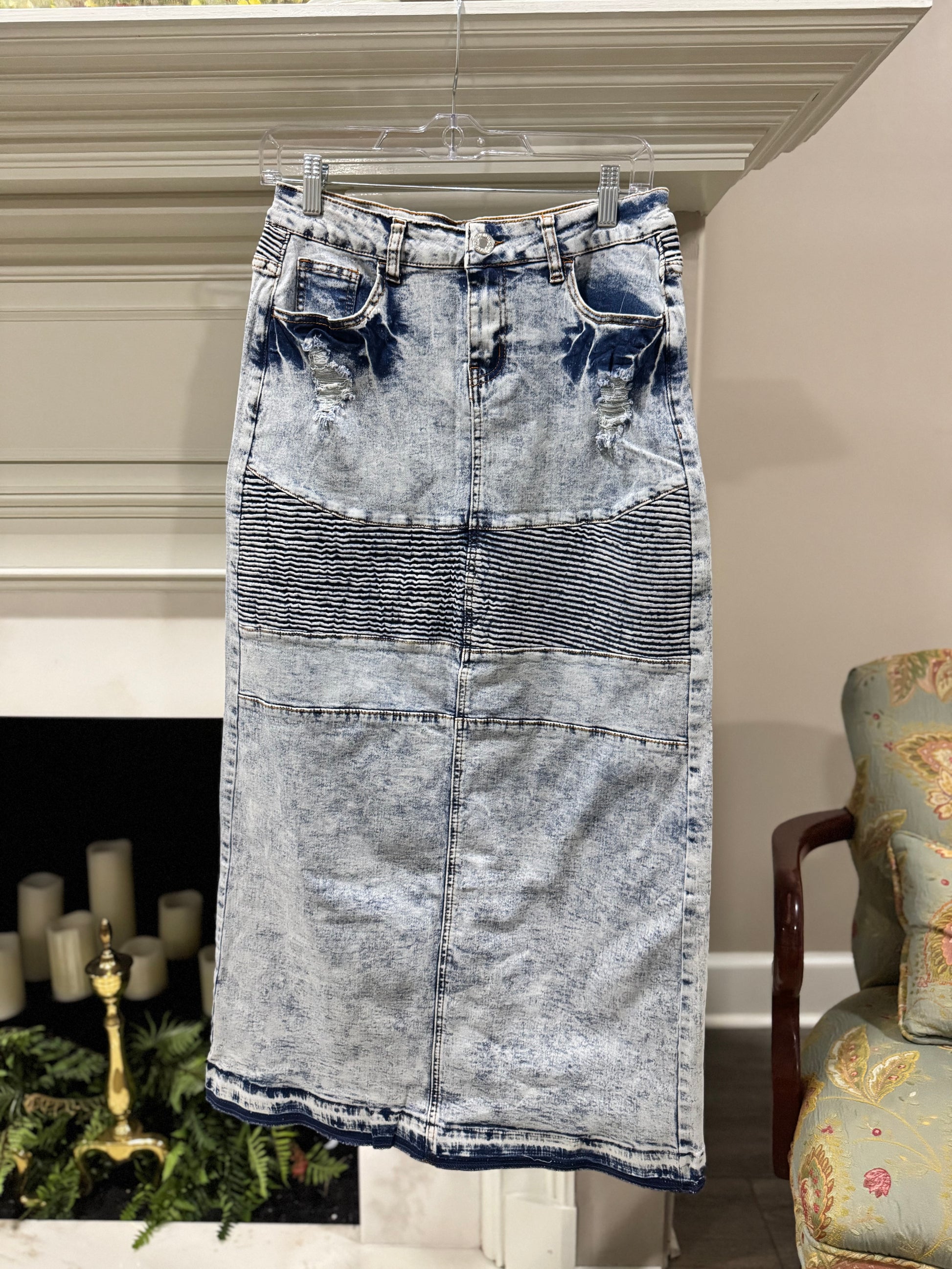 Upgrade your denim game with our Light Acid Wash Distressed Denim Skirt. Made with a light acid wash and distressed design, this maxi skirt is perfect for adding a touch of edginess to your outfit. The lightweight fabric and comfortable fit make it a versatile piece that you can wear all day long.