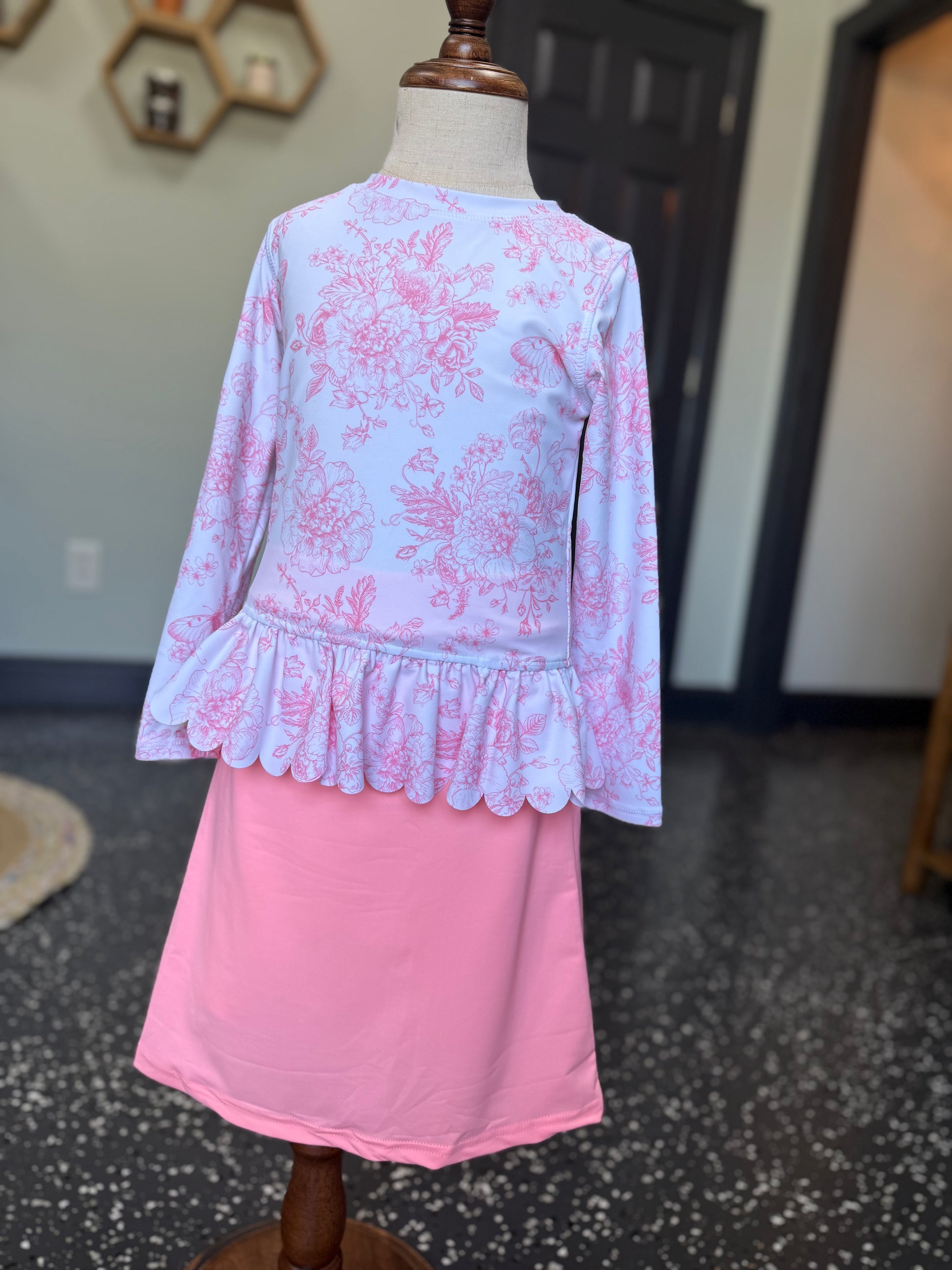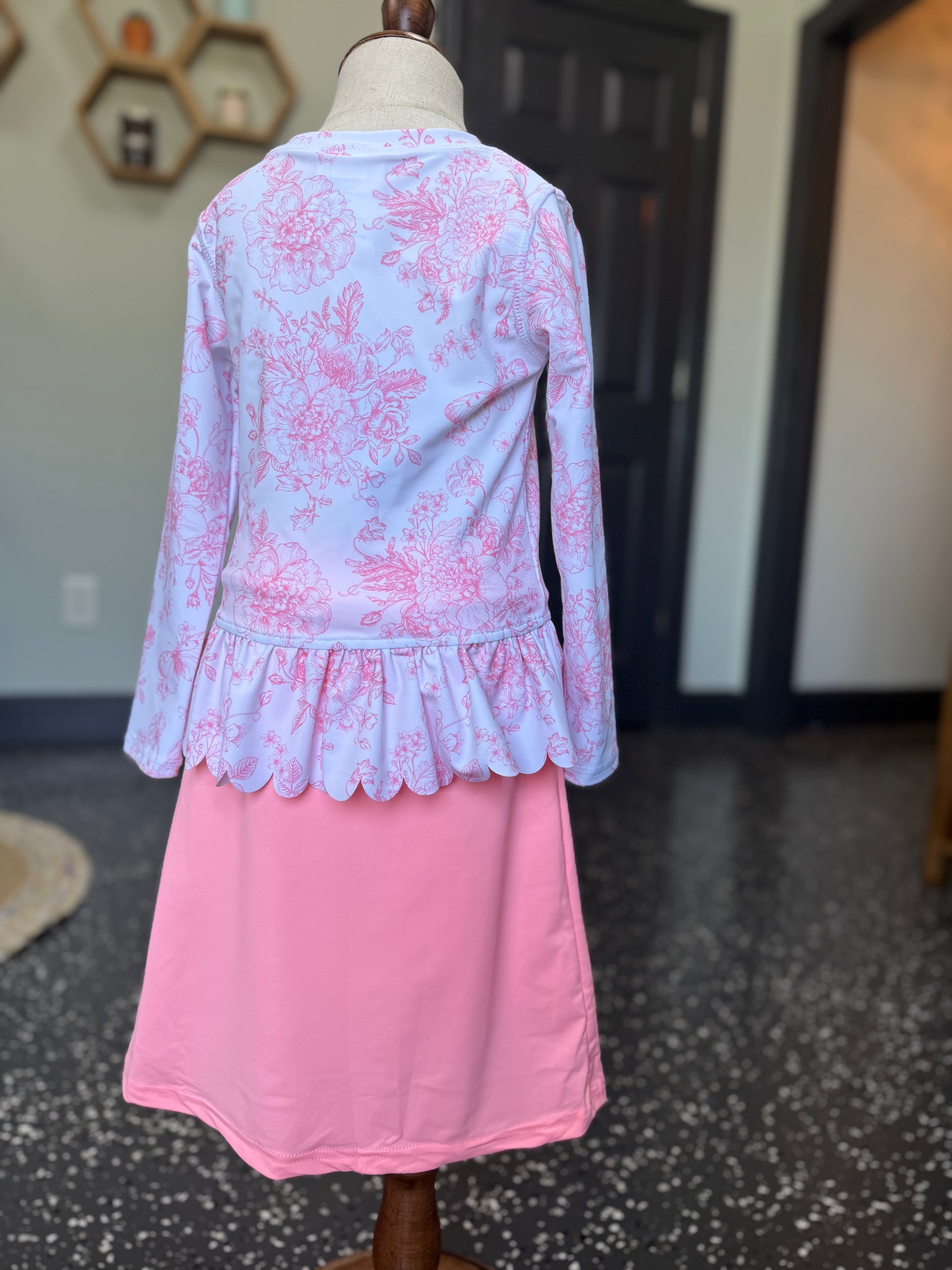 Bright, fun, and full of sunshine vibes! 🌞 Our Lil’ Coral Bloom swimsuit set is designed for splashing, playing, and soaking up every summer adventure. The vibrant neon coral pink swim skirt features hidden built-in modesty coverings for worry-free movement, while the coordinating RuffleButts rash guard adds a touch of elegance with its floral print and scalloped peplum hem.