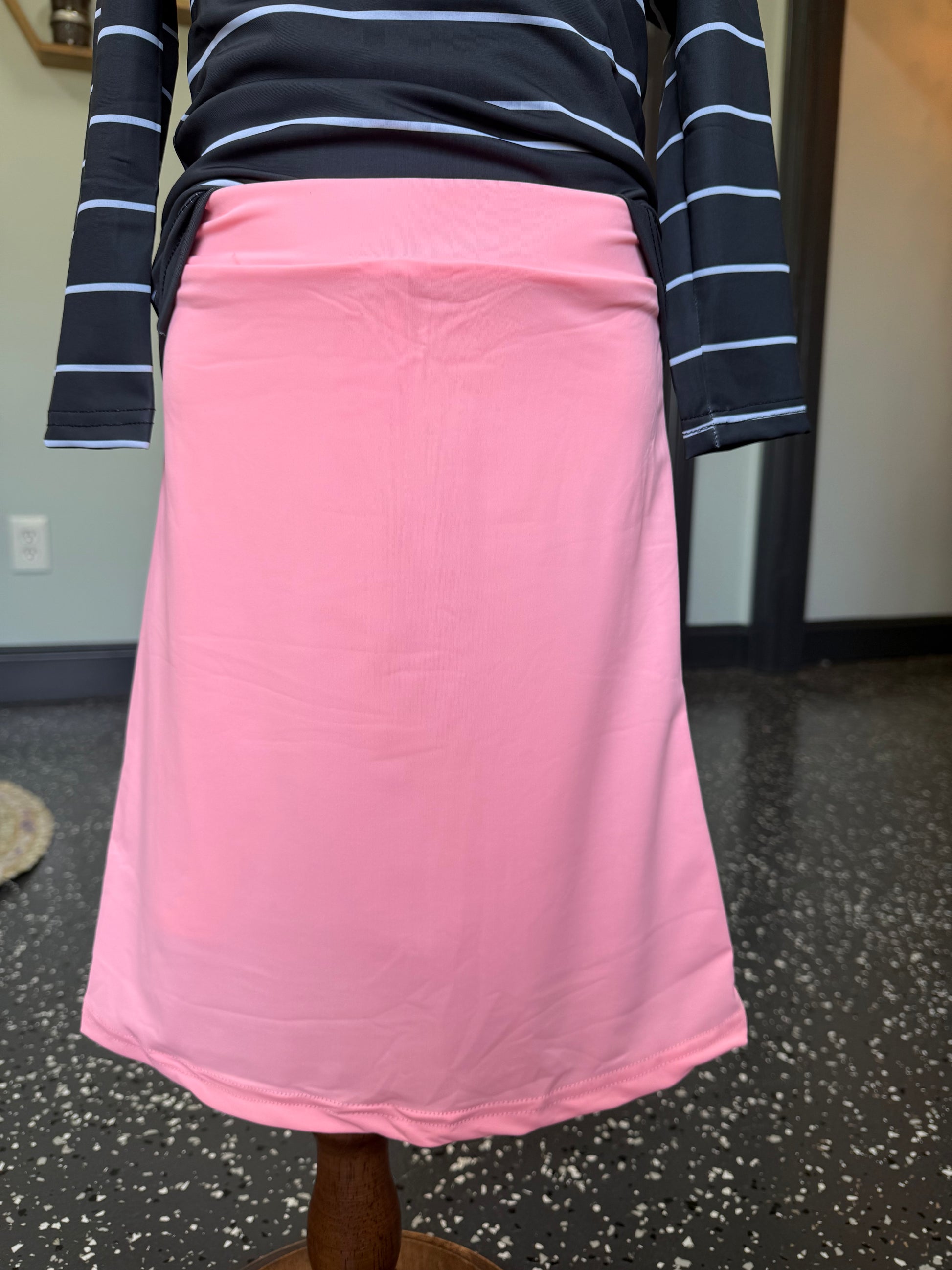 - Neon coral pink skirt with built-in shorts for modest coverage