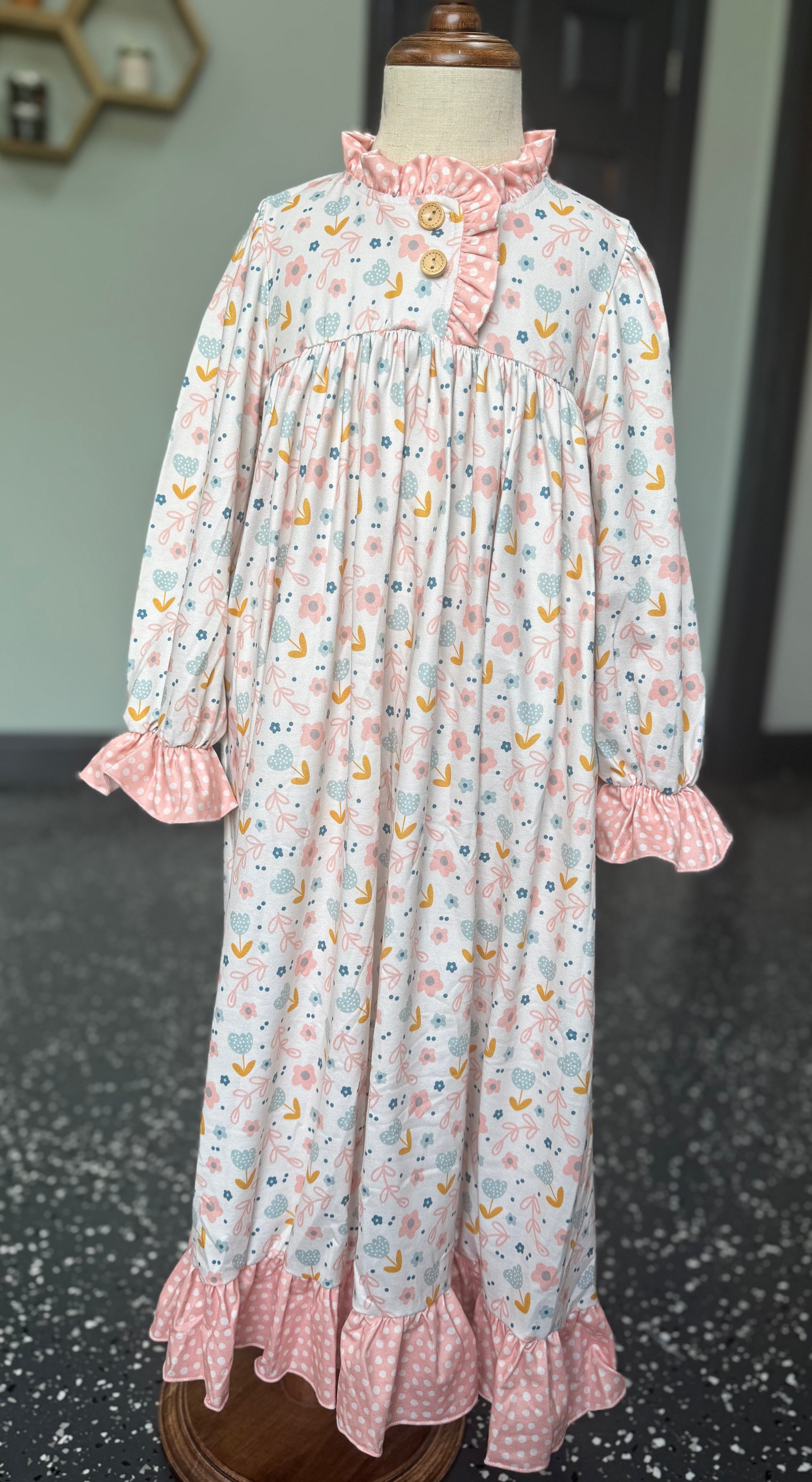 Your little one will love twirling, lounging, and snuggling in the Lil’ Ophelia Meadow Babydoll Gown. Designed to match Mommy’s gown, it features the same delicate floral print, pink polka-dot ruffles, and ankle-length babydoll silhouette. Functional buttons and hidden pockets make it as practical as it is adorable.