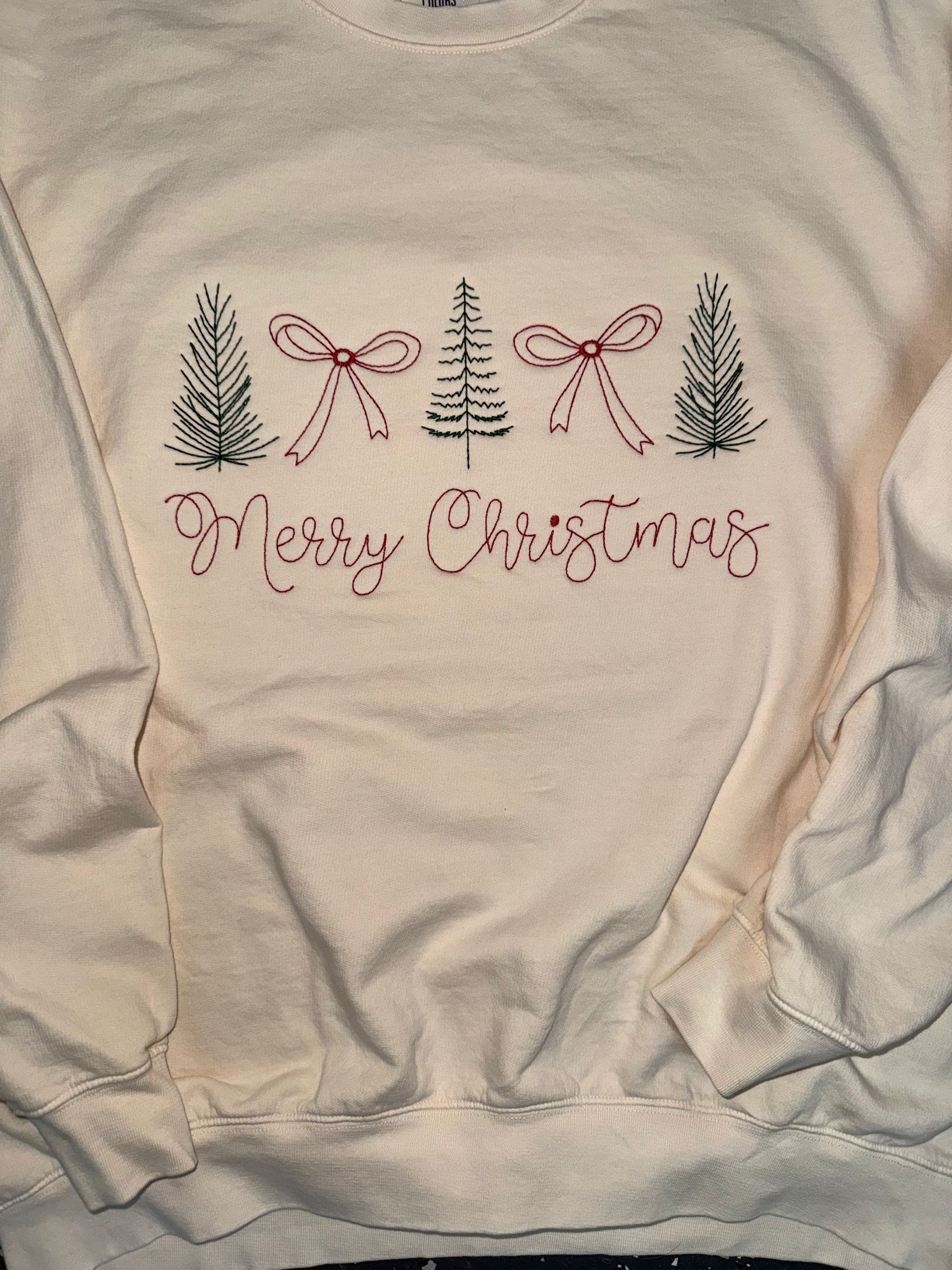 This soft Jerzees crewneck features three delicate evergreen trees topped with dainty red bows and “Merry Christmas” embroidered in elegant script — simple, timeless, and cozy for all your holiday moments.