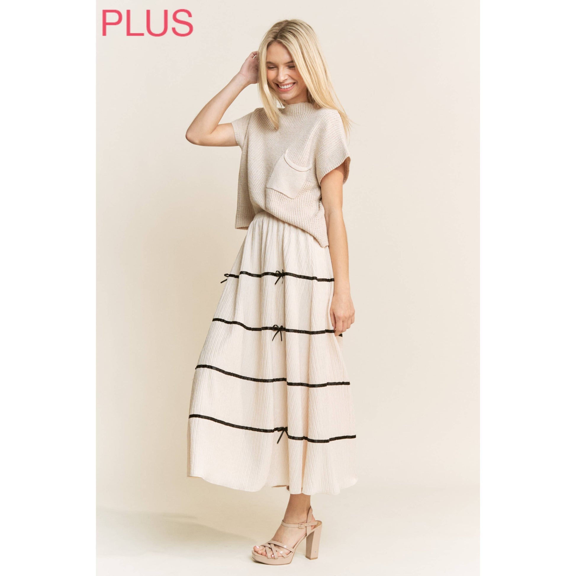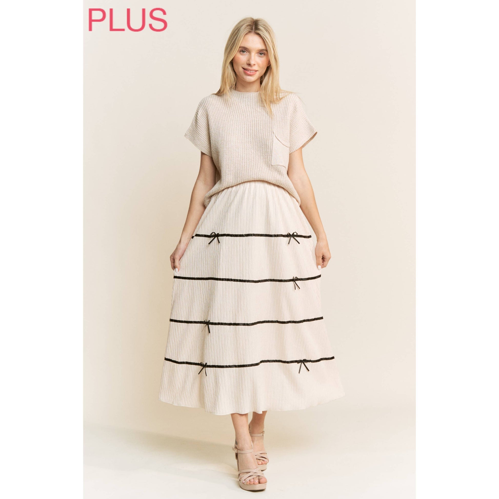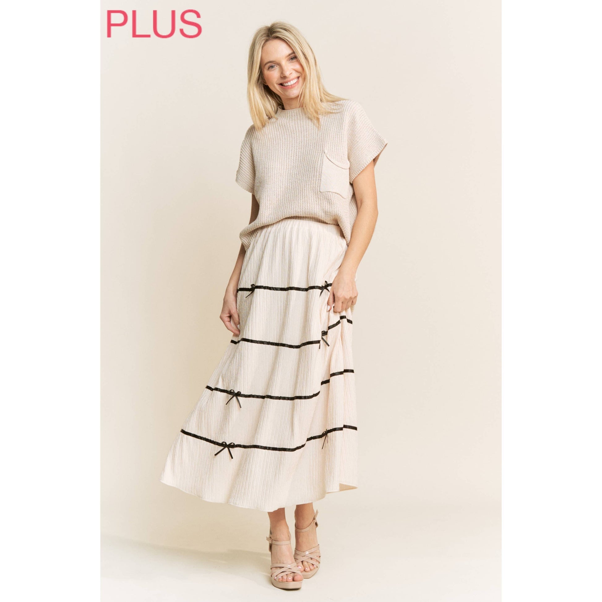 Sweet, feminine, and easy to wear—the Chantilly Bow-Tier Maxi Skirt is made from a soft, textured medium-weight knit that drapes beautifully without feeling clingy. Designed with a comfy elastic waistband and a fully lined interior for confident coverage, this skirt features delicate contrast trim bands and the cutest little bow tacking details that give it that boutique, vintage-inspired charm. Dress it up with a blouse or keep it casual with a simple tee—either way, it’s a standout.