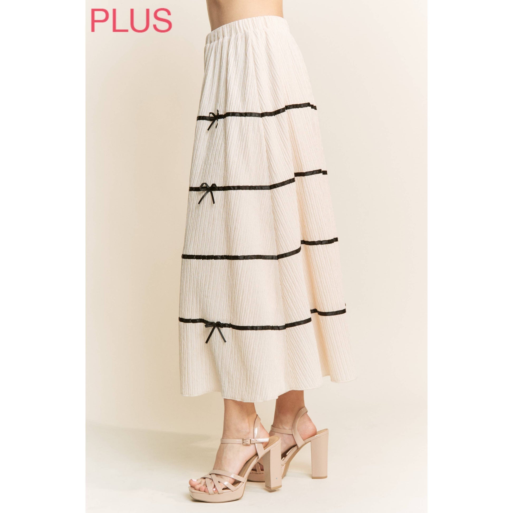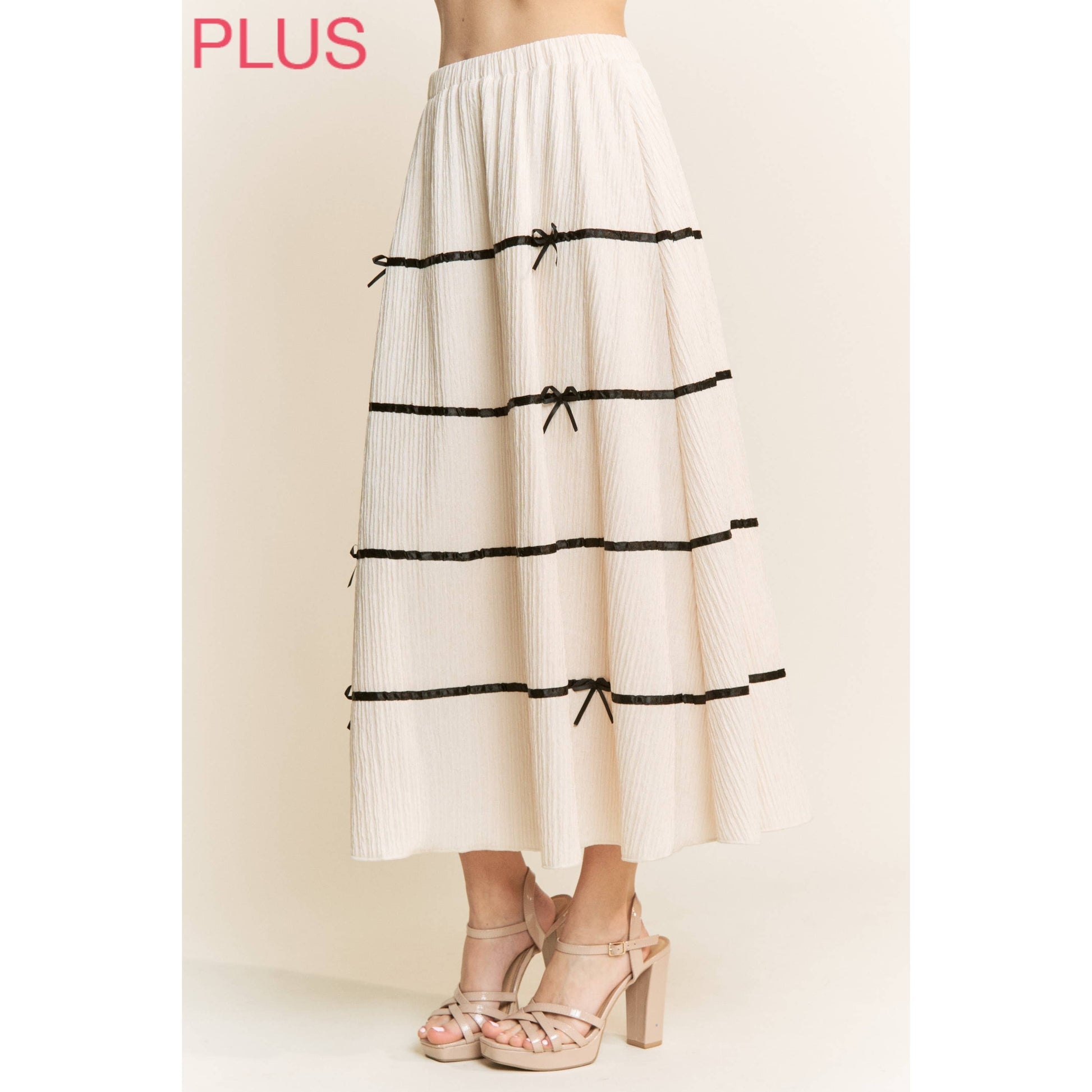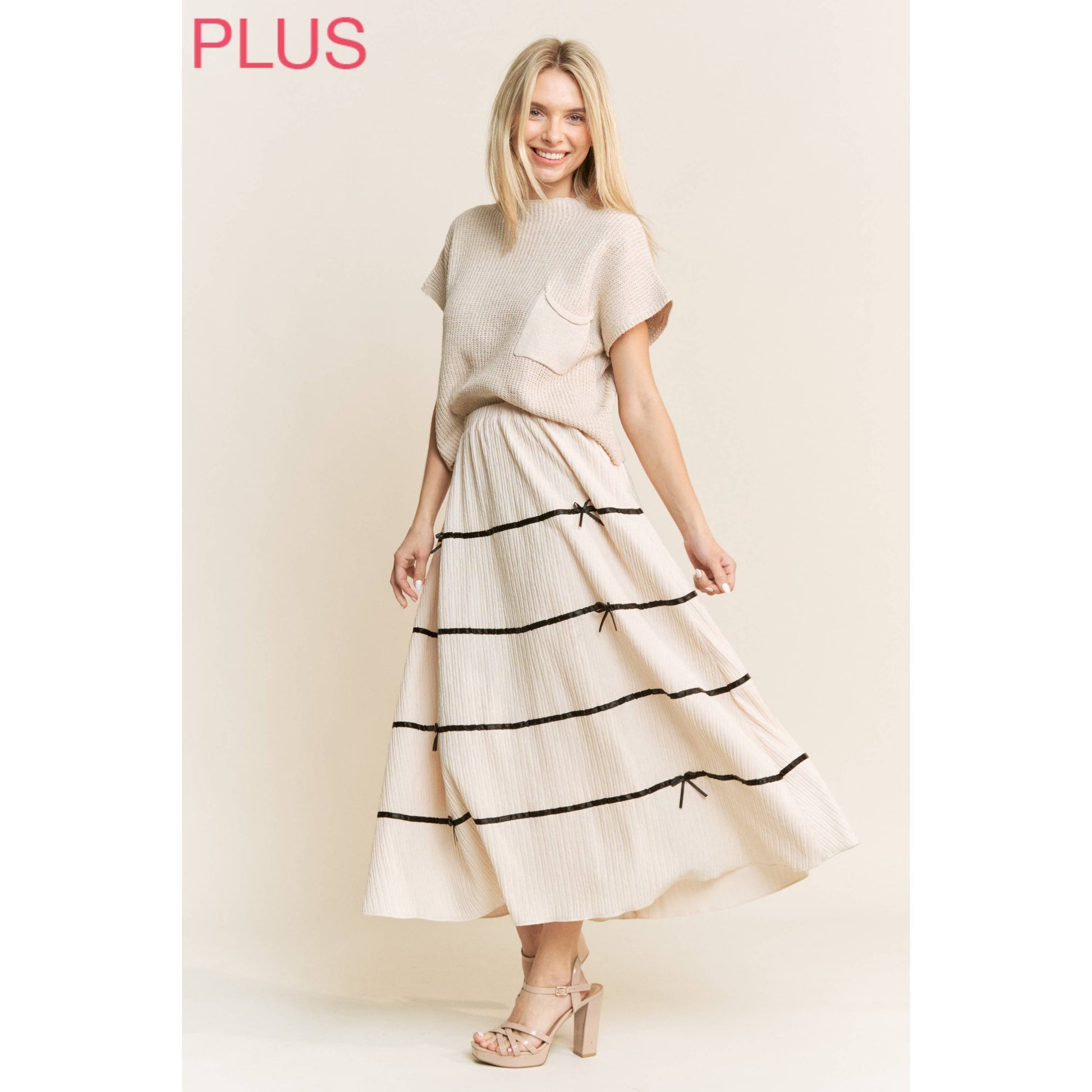 Sweet, feminine, and easy to wear—the Chantilly Bow-Tier Maxi Skirt is made from a soft, textured medium-weight knit that drapes beautifully without feeling clingy. Designed with a comfy elastic waistband and a fully lined interior for confident coverage, this skirt features delicate contrast trim bands and the cutest little bow tacking details that give it that boutique, vintage-inspired charm. Dress it up with a blouse or keep it casual with a simple tee—either way, it’s a standout.