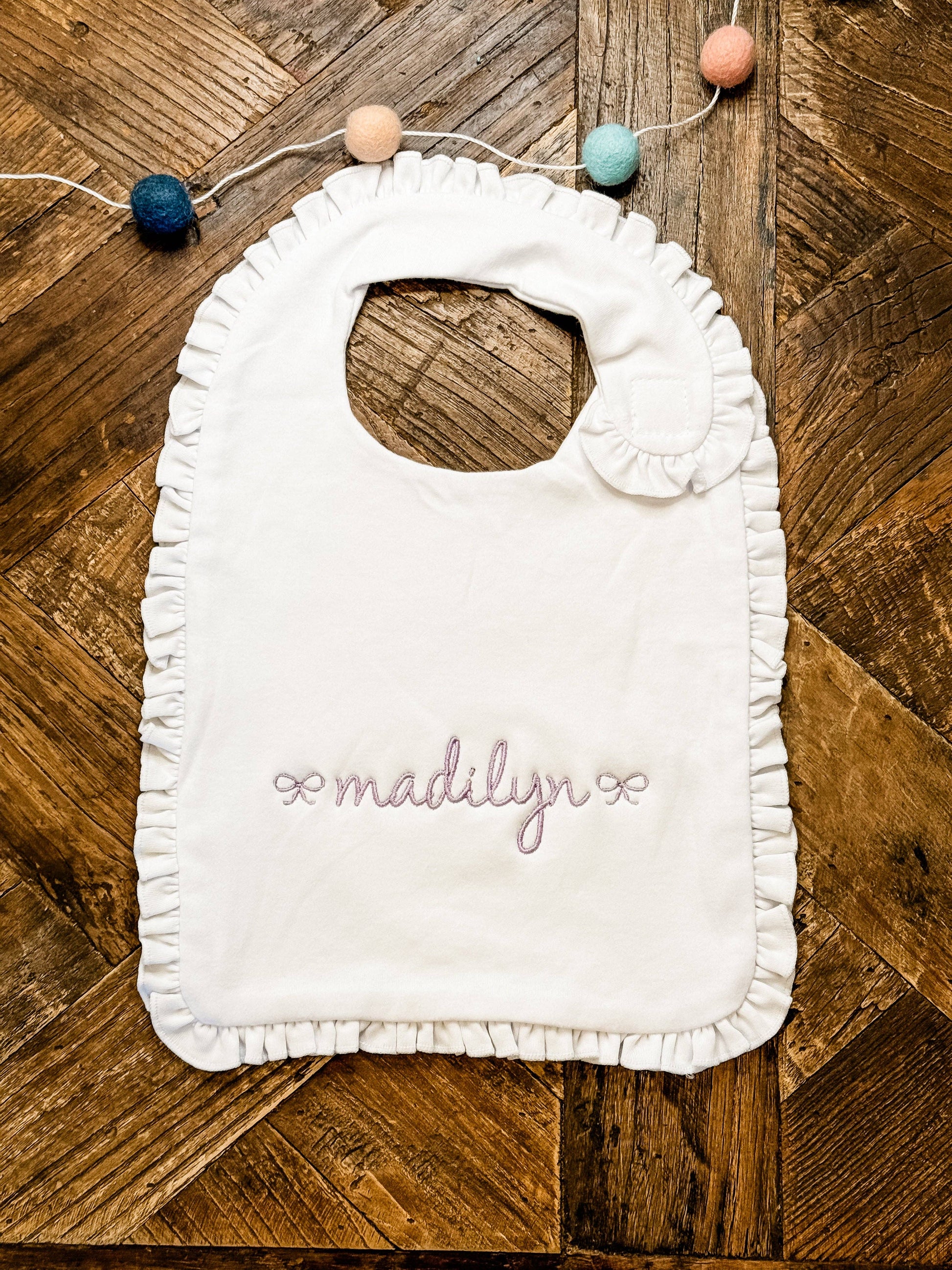 Our Ruffle Bib is a delightful addition to your baby's mealtime. This bib, in white with white trim, is designed with a charming ruffle detail. Perfect for little ones, it helps to keep their outfits clean during feeding. This can be customized and embroidered for your little one to cherish for as long as she needs a bib