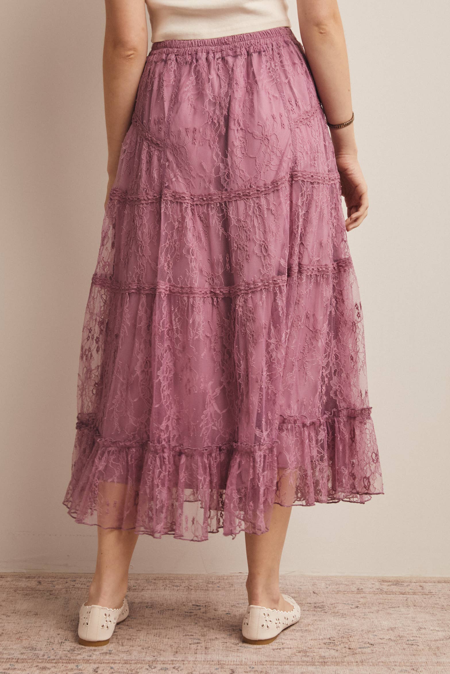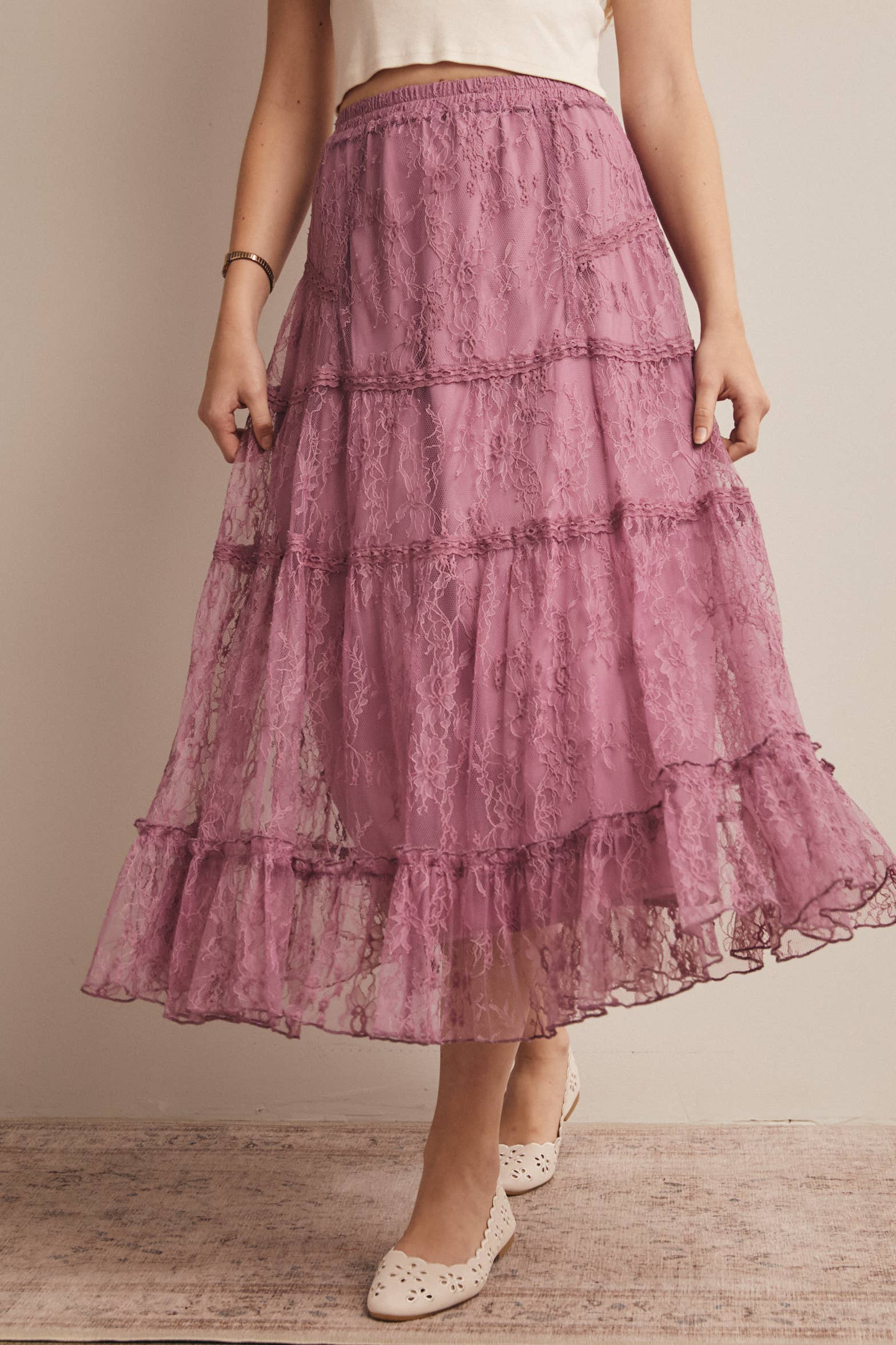 Feminine Ruffle Hem: Soft flounce detail along the hem enhances the feminine silhouette Elegant and dreamy, this lace skirt blends timeless femininity with modern versatility-perfect for pairing with blouses, knits, or graphic tees for everything from casual days to dressed-up evenings.