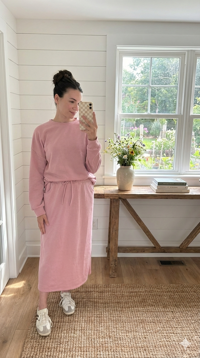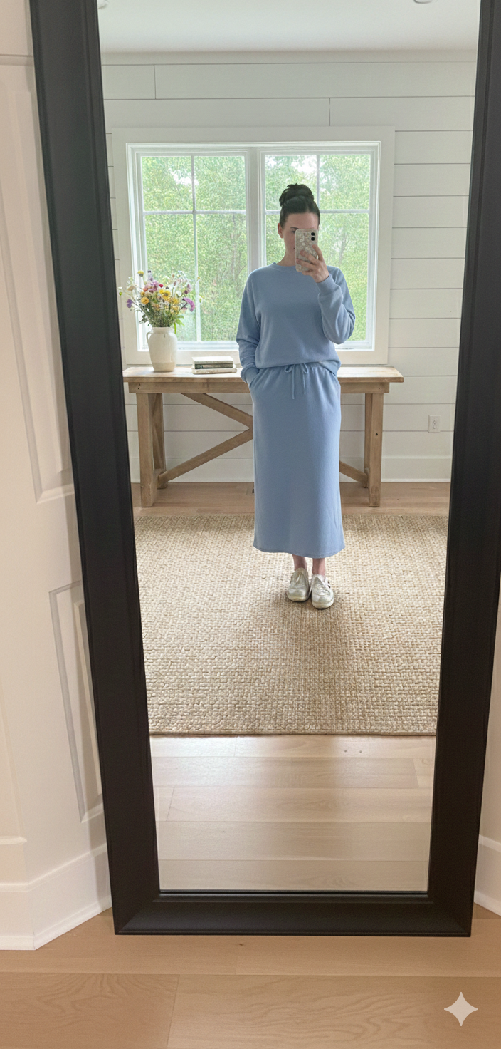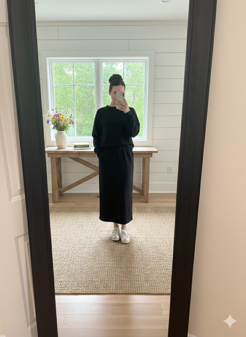 * The Skirt: A sophisticated midi length that offers a flattering drape and effortless movement.
